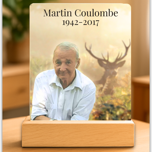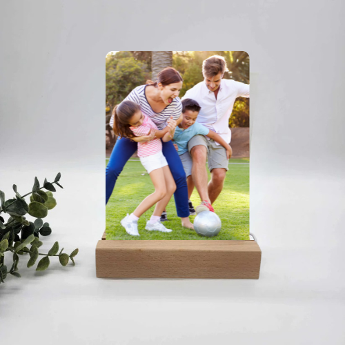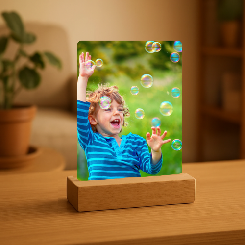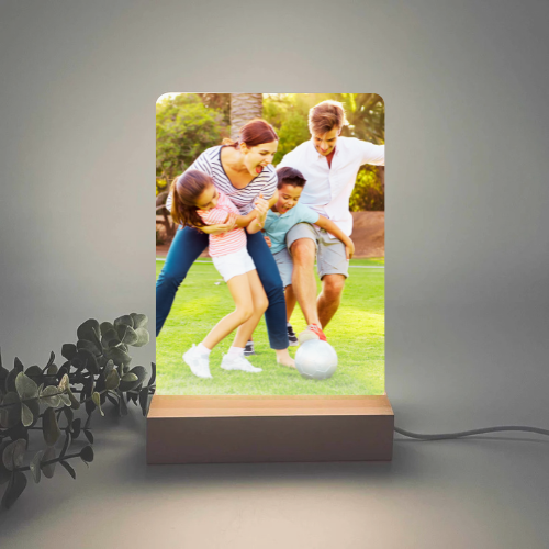 Le support, en bois naturel, est muni d’une interface USB, qui illumine le cadre photo avec des LED de couleur chaude.
