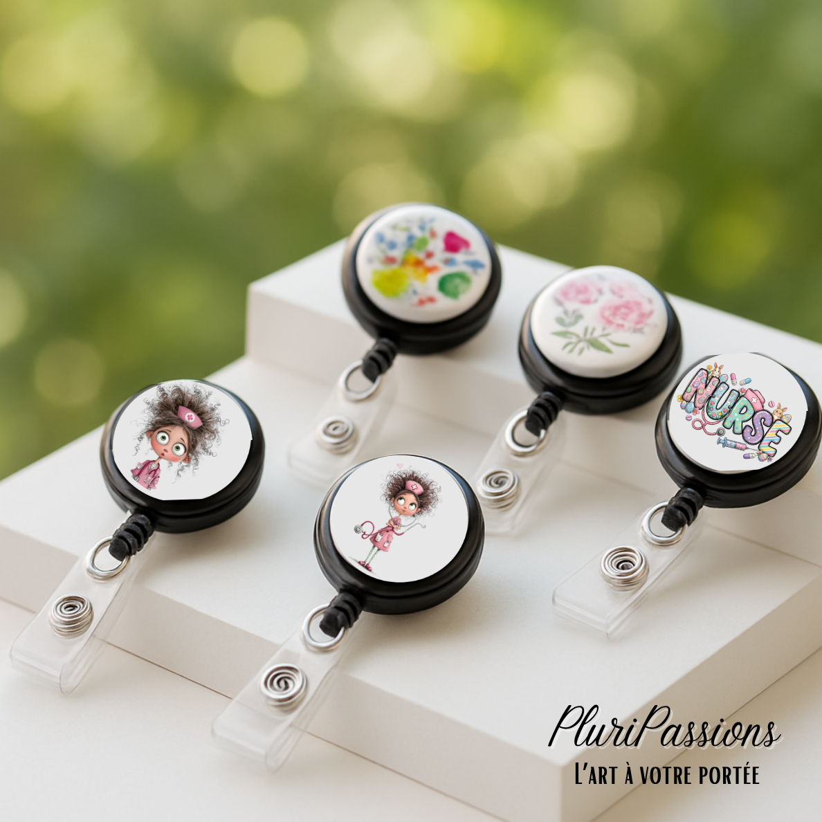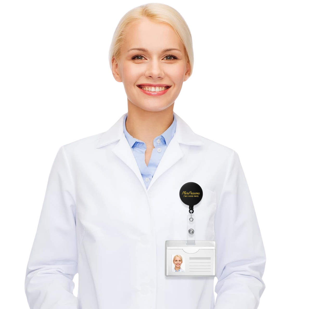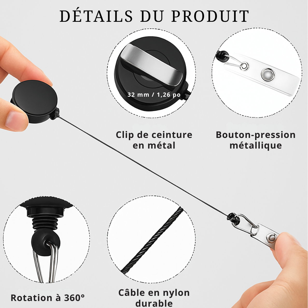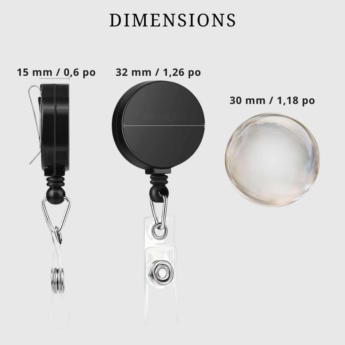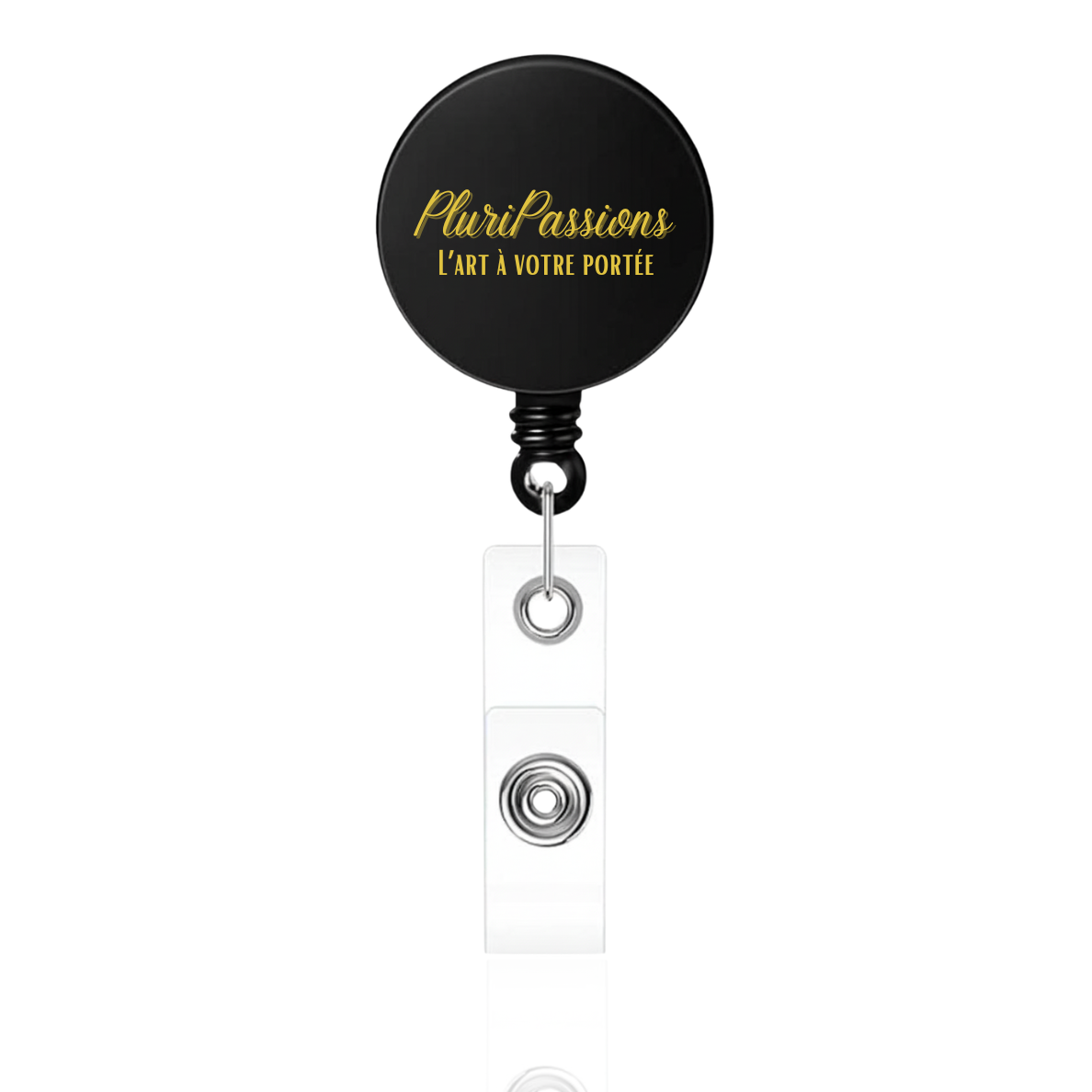 Porte-badge rétractable fabriqué en matériau ABS et recouvert d’un cabochon dôme transparent en verre.